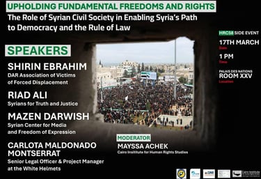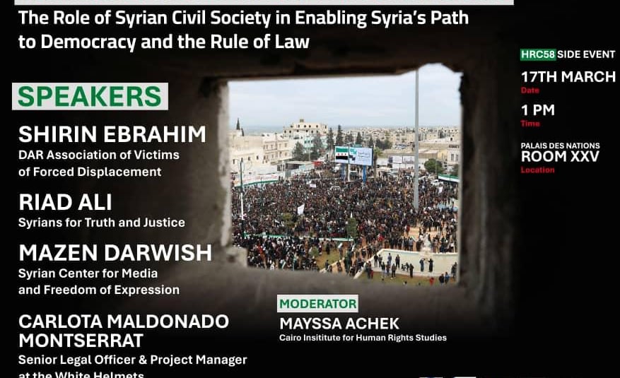 شاركت رابطة دار لضحايا التهجير القسري الاثنين 17 آذار في الحدث الجانبي الذي عُقد على هامش الدورة 58 لمجلس حقوق الإنسان، تحت عنوان "دور المجتمع المدني السوري في تمكين سوريا من الوصول للديمقراطية وسيادة القانون" بالشراكة مع مركز القاهرة لدراسات حقوق الإنسان، سوريون من أجل الحقيقة والعدالة، المركز السوري للإعلام وحرية التعبير، والدفاع المدني السوري.