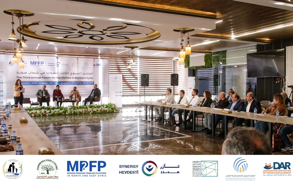 تحت شعار "الإنصاف والعدالة للجميع"، انعقد المنتدى السنوي الثالث للضحايا في شمال سوريا بتاريخ 15 تشرين الثاني/نوفمبر 2024، لمناقشة أبرز القضايا المتعلقة باحتياجات وأولويات الضحايا، بما في ذلك كشف مصير المفقودين/ات والمختفين/ات قسرياً، سبل العودة الآمنة والطوعية للنازحين/ات والمهجرين/ات قسرياً، مواجهة تحديات الاستقرار، وضمان مساءلة مرتكبي الانتهاكات، بالإضافة إلى استعراض مسارات العدالة المتوفرة للضحايا في سياق الصراع السوري.