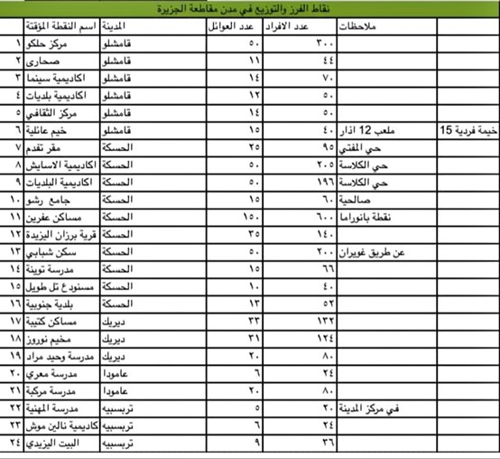 وفي الحسكة استضافت عددًا كبيرًا من العائلات المهجرة في مواقع مختلفة، من بينها مقرات أكاديمية، ومساكن شبابية، ومدارس، إلى جانب مواقع أخرى مثل جامع رشو ومساكن عفرين.
